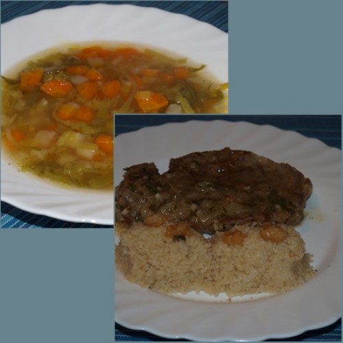 Zelenjavna juhica; vratovina v omaki, ku-kus; zelena solata: