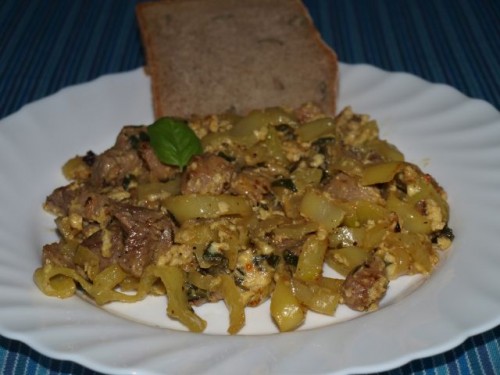Danes nekaj na brzino, in sicer: v voku pražen puranji mesek, mlada čebula, paprika, za po vrh še jajček, domač kruh. Seveda, še skleda zelene solate: