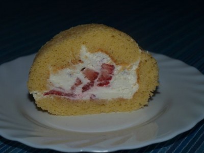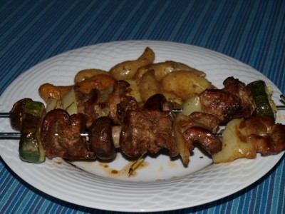 Mesno-zelenjavna nabodala, pečen kifljčar, zelena solata; jagodna rolada: