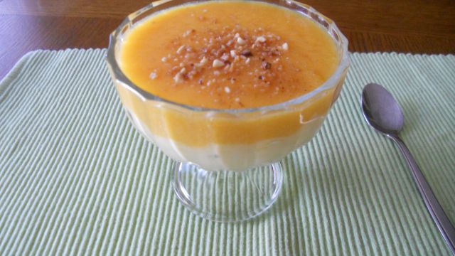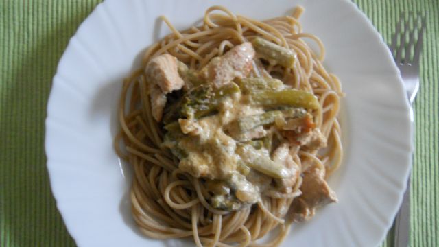 Šparglji s testeninam, solata, vanilijeva krema z breskovim prelivom, ![]()