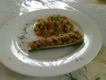 mali kuharPri nama pa ajdova in prosena kaša z zelenjavo, polnjene bučke s sejtanom in solata.