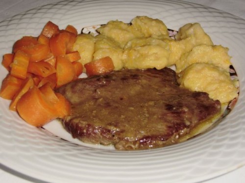 Goveji zrezki v omaki, žličniki z naribanim korenčkom, dušen korenček, zelena solata: