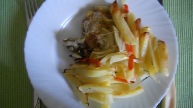 Tinky BinkyDanes: svinjske zarebrnice s čebulo, krompirjem in korenčkom v pečici, solata