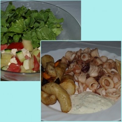 "Frigani" kalamari, pečen kifeljčar, jogurtovo-česnova omaka; zelena in grška solata: