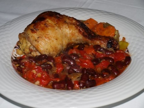 Nadevano piščančje bedro, zapečena paprika s fižolom; mešana solata: