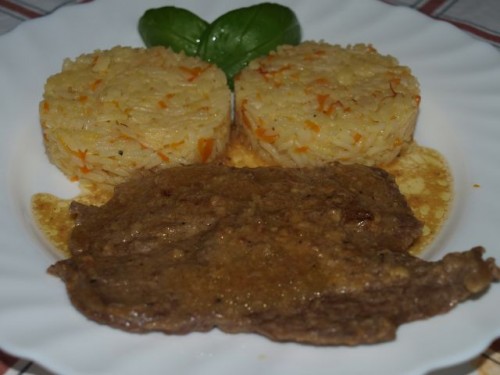 Gosta bučkina juhica; goveji zrezek v omaki, riž z bučkami in korenčkom; mešana solata: