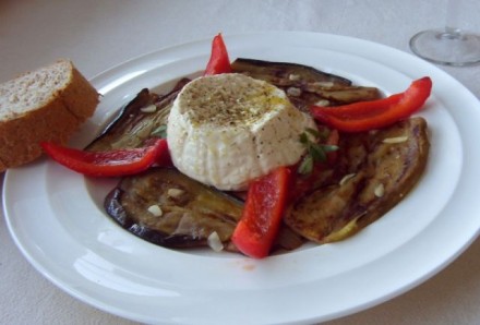 irena66Danes: mlad, svež kravji sir, popečeni jajčevci, paradižnik in paprika, kruh, teran, voda