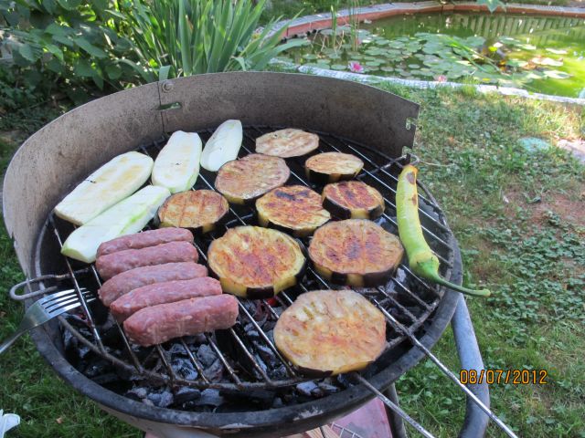 Včeraj: zgodnja večerja z žara - čevapčiči, vratovina. hrenovke. bučke, melancane, paprika.
