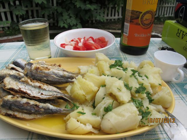 ledenka_Pri nas bo pečena riba v pečici (orada ali brancin), krompir z blitvo (malo z mojega in malo s taščinega vrta), zelena solata (tudi malo mešana bera) in malo nizkega fižola v solati (tudi z vrta).