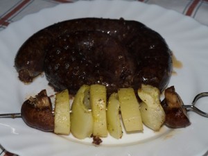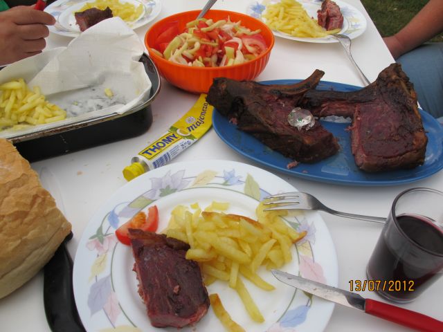 Na žaru pleskavice, piščančji ražnjiči, testeninska solata, šopska solata, aha, za predjed tatarski biftek, za posladek pa torta z osebno izkaznico, sprintano na hostiji (čudne želje čud(ašk)nega mladega moža. Pa sok, malt, voda, alkohola pa nič.