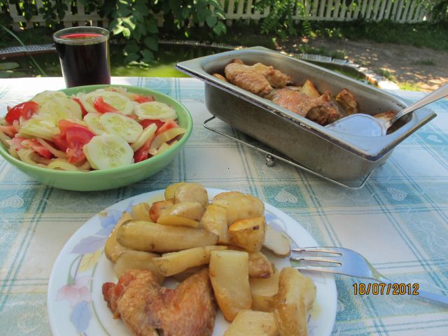 Nedelja: goveja juha, piščančji fingersi ocvrti v mešanici corn flakesa, drobtin, suhega peteršilja in suhega česna, ocvrte bučke, pomaka iz kisle smetane, jogurta, limone in začimb, zelena solata