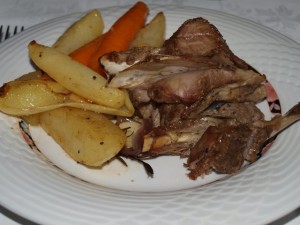 Pečen krompir s korenčkom in čebulo, jagenjček, zelena solata; breskve v mixu: