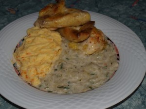 Kurja juhica s korenčkom in ribano kašico; pečen piščanec, pire (krompir / korenček), kumarična omaka; zelena solata: