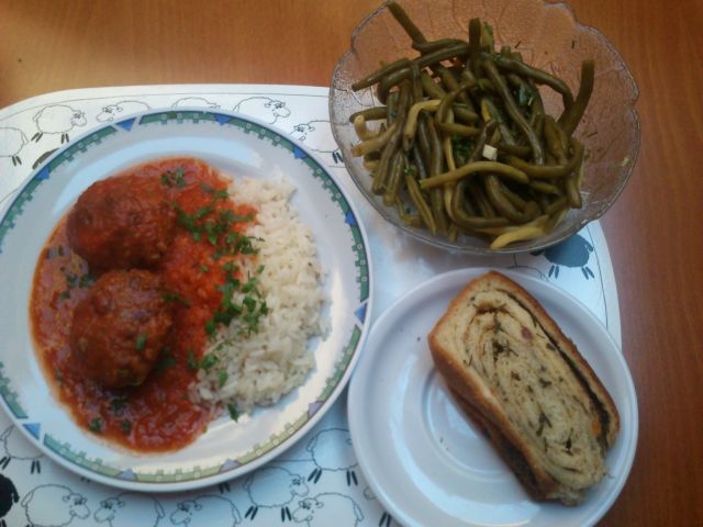 Paradižnikova juhica s "knedlčki"; vratovina v gobovi omaki, zelenjavna rižota; goveji zrezek v omaki, zelenjavna rižota; zelena solata, nariban korenček v solati (za tistega, ki še nima vseh zob):