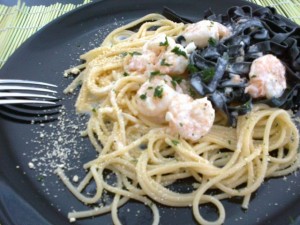 msegovDanes kozice v smetanovi omaki s špageti in črnimi rezanci, paradižnikova solata z baziliko in česnom in