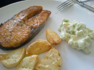 Kjer je volja, tam je pot. TrixiDanes krompir in losos iz pečice, omaka iz jogurta in kumar, ledenka v solati,