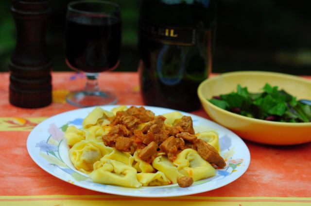 JulijaDanes pri nas: goveje-kurja juha z domačimi rezanci, korenčkom in drobnjakom, zelenjavni riž, popečena kokoška iz juhe, raduč v soalti, pozno popoldan, še na sončku, kava in jabolčno-malinova pita.