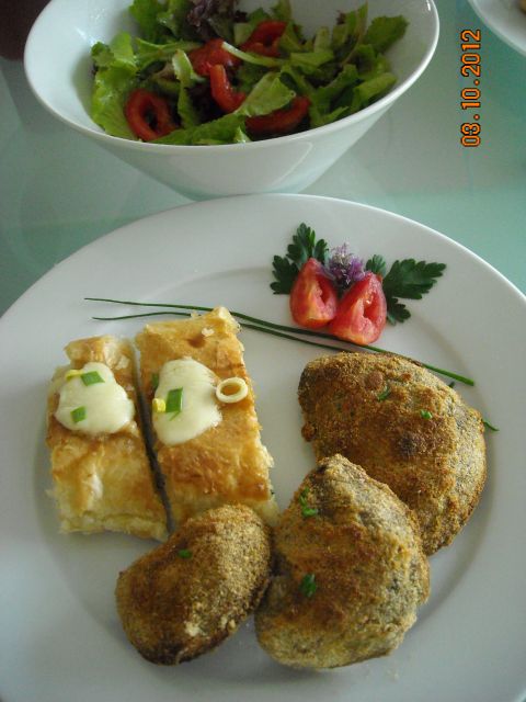 Marele in porov zavitek z drobnjakom in petršiljem iz pečice, solata.