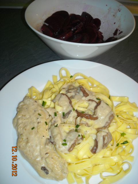 Piščanec v omaki z jurčki, rezanci, pesa je z bučnim oljem.