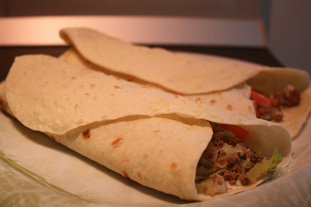 Tortilja zvitki z prazeno govedino, zelenjavo in ostigino omako , skleda solate