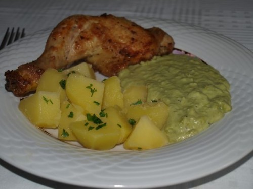 Pečeno piščančje bedro, krompir v kosih, grahov pire, matovilec: