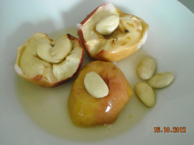 jesenski lonec, pečena jabolka, omakica je z moštom in mandlji.