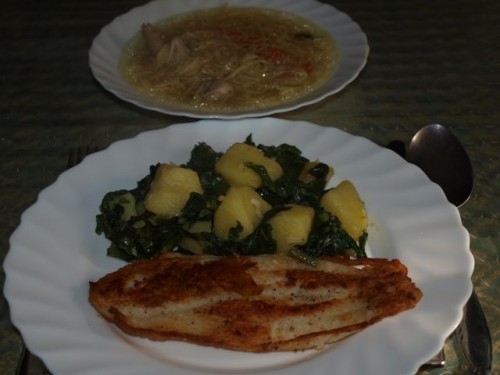 Kurja juhica z domačimi rezanci; pečen file "vitkega soma", krompir z blitvo in veliko česna; zelena solata, ![]()