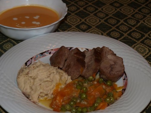Bučna juhica; puranja pečenka, matevž, grah s korenčkom v omaki; endivija s krompirjem: