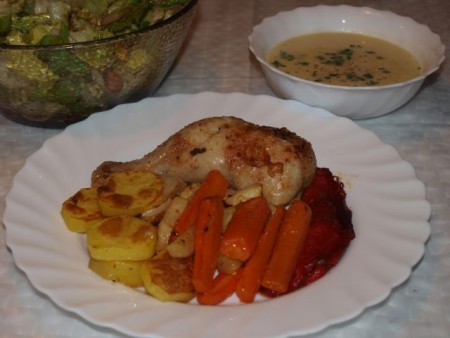 Kurja juhca, riževe kroglice in malo pečenega krompirja z čebulo in korenjem, pečena sv. rebra in zelena solata, za posladek pa tiramisu.
