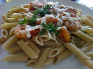 Včeraj polnozrnate testenine s paradižnikovo omako in kozicami, parmezan, solata in