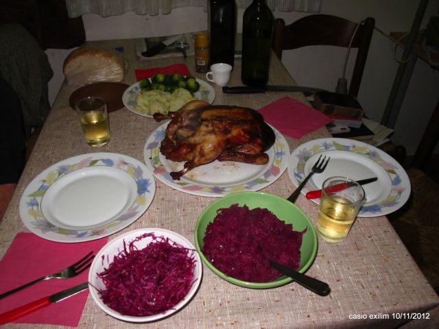 Danes tašča peče gos in raco, oboje v pečici, gos nadevana. Mlinci, pražen krompir in rdeče zelje (jaz ga ne maram, razen surovega v solati, kot je že ena pred menoj napisala), solate. Tradicija, ki se ji ne iznverimo. No, ene dva krat nam je mladim uspelo prepričan starejši del družine, pa smo naredili raco v pomarančni omaki in je bilo sicer ok, ampak smo potem znova prešli na klasiko.