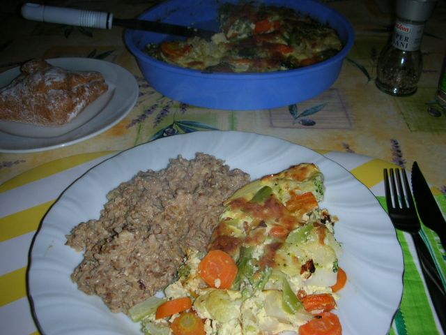 Goveja juha z vraničnimi žličniki, ajdova kaša z jurčki, popečena zelenjava s sirom in eno kupljeno pecivo, že malo priskočim na pomoč v kuhinji, čeprav še vedno okrevam, pozdravček