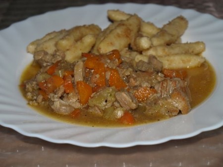 Krompirjevi svaljki, svinjski ragu, korenčkova solata: