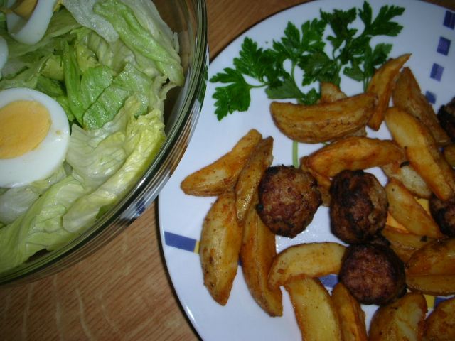 matejaozDanes: mini polpetki, pečen krompir, velika skleda zelene solate