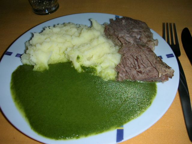 Nedelja: Goveja juha, popečena poletna s sirom in šunko/riž z gobicami/njoki in žrebičkovo meso v omaki, solata, ledeno nebo.