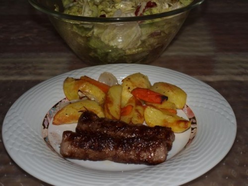 Čevapčiči, pečen krompir, zeleni in rdeč radič: