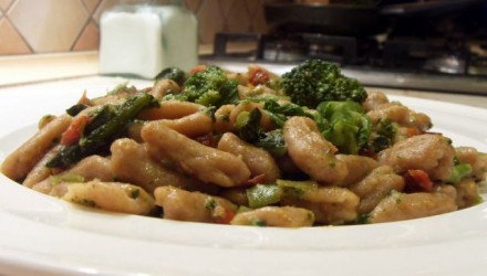 Danes: domače testenine (polnozrnata pšenična moka, buča, voda) z brokolijem, suhim paradižnikom, inčunom, česnom in začimbami