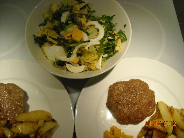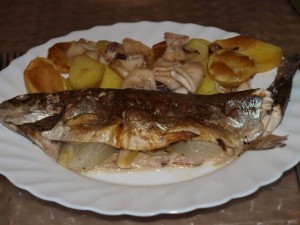 Juhica /goveji rep/ z domačimi rezanci; postrv s krompirjem, z dodatkom kalamar; endivija s čičeriko: