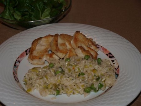 Popečen piščančji file, riž z grahom in porom, matovilec:
