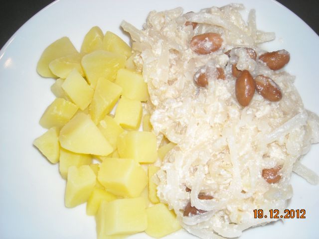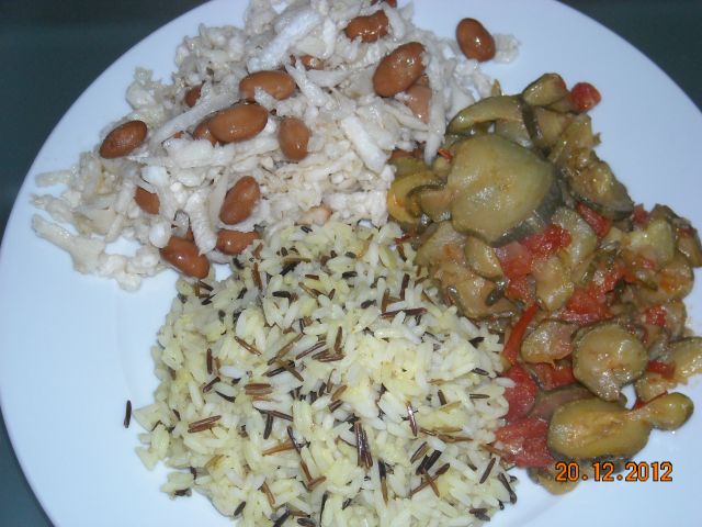 Danes sem sam in sem si naredila dupene bučke, mešan rižek s curryjem, črna redkev in fižol.