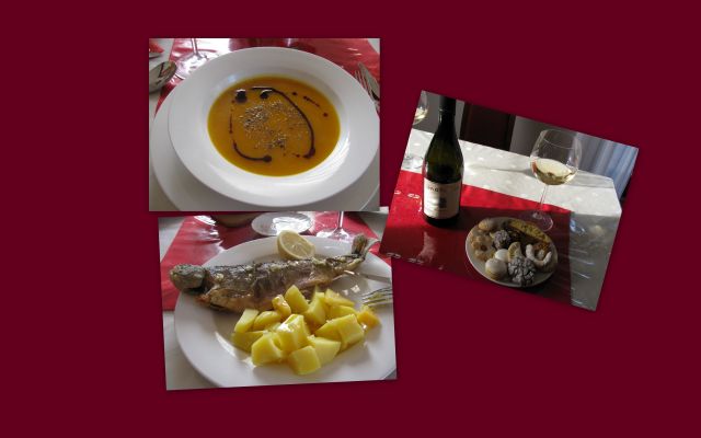 mzmPri nas pa danes bučna juha, v kosih krompir z kolerabo in česnom, in pa ribe po izbiri, brancin, orada, skuša in pa za mene postru. Zraven seveda malo belega vinčka.