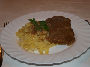 gobica1402Danes: Krompirjeva juha, telečji zrezki v jurčkovi omaki, polenta, zelena solata s fižolom, potička in kava s smetano