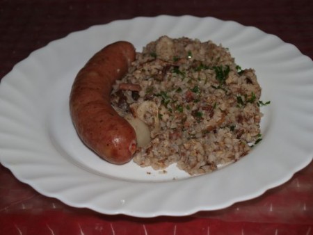 Ajdova kaša z jurčki, klobasa, rdeča pesa:
