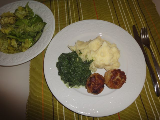 Danes: pire krompir, špinača, mleto meso malo drugače, zelena solata s fižolom.