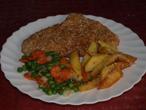 Goveja juhica; paniran puranji zrezek, pečen krompirček posut s parmezanom, dušena zelenjava (zmrznjena ![]()