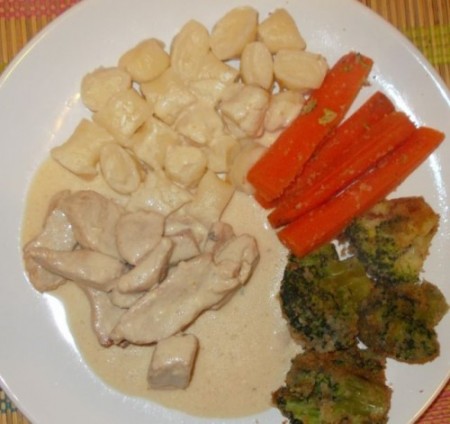 ANJASkutini njoki, puranji trakci v omaki in zelenjava, pa skleda solate