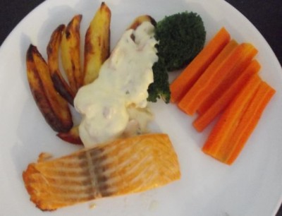 Popečen losos, krompir iz pečice, zelenjava, malo omake in solata.
