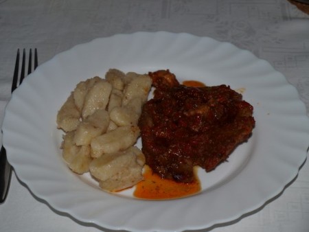 Kremna grahova juhica; krompirjevi njoki, sv. zrezek na prepraženi papriki; solata; puding: