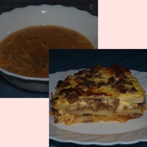 V nedeljo goveja juha z domačimi rezanci, lazanja, mešana solata Včeraj mož hrenovko in sveže kislo zelje v solati, jaz spomladanske zvitke. Sacher rezine in smetana. Pa polsladkega muškata iz enega domačega štajerskega vinograda. Danes pikantna porova juha. Za zraven pa še ne vem.