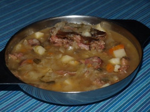 Včeraj: goveja juha, puranji zrezki v smetanovi omaki s sirom, kuskus, solata